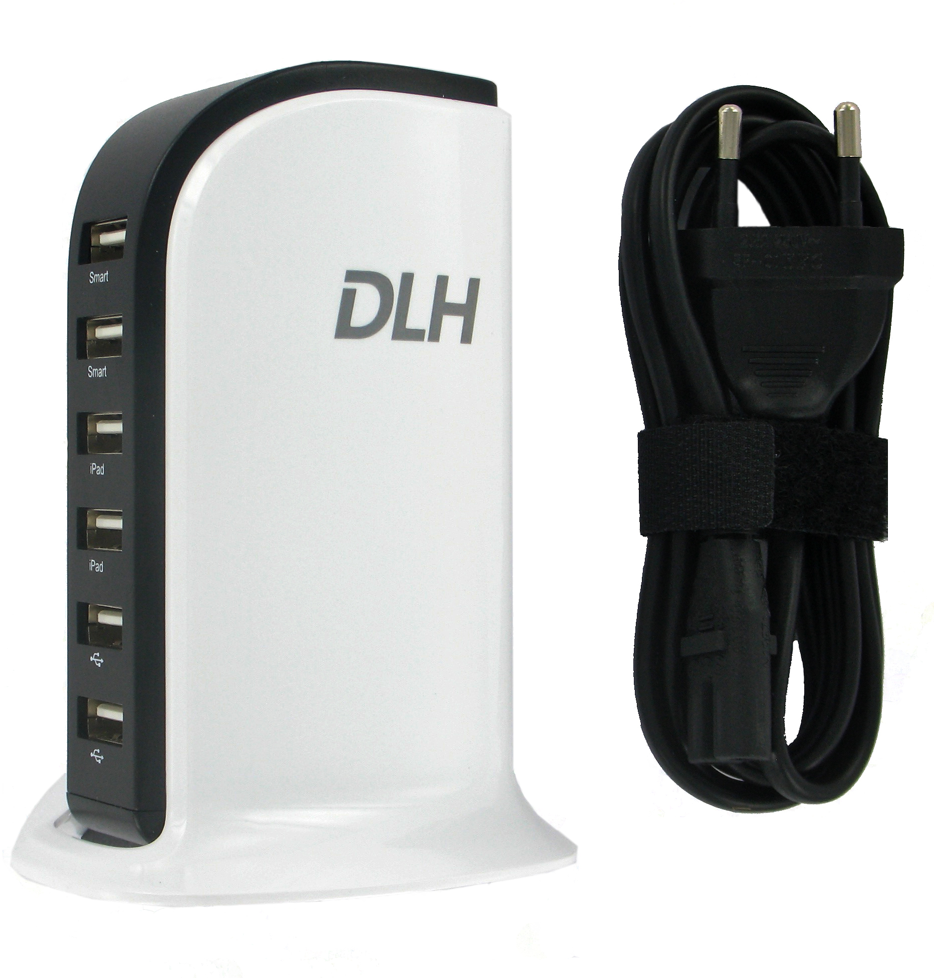 ~~~ 6 ports USB (8A max). 40W max. Boîtier blanc et noir design. Socle pour position verticale. Charge simultanément six appareils. Cable secteur fourni. Compatible tablettes et smartphones se chargeant en USB.